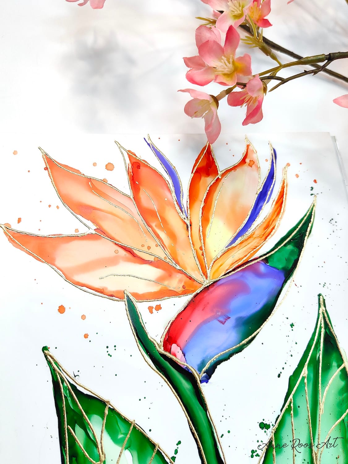 • Material: Alcohol inks with faux gold leaf details on synthetic paper, protected with (UV) varnish