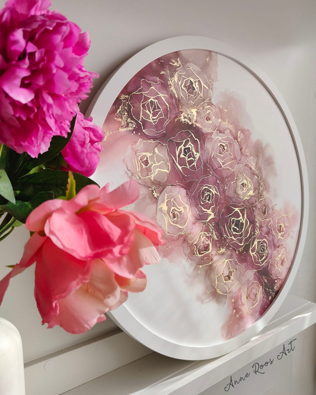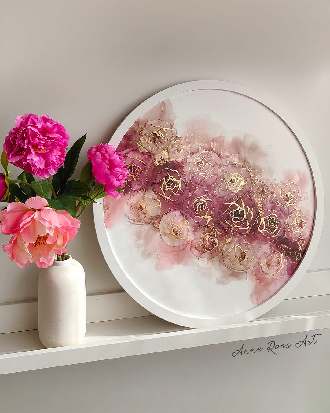 Romantic Roses is an original artwork with my signature roses. This romantic color palette beautifully blends into each other: The beige and soft pink colors together with the contrasting, deep purple gives a romantic and dramatic look to the artwork. Finished with the iconic golden metallic lines that will beautifully reflect in daylight. A true eye-catcher for any living room, bedroom or study.