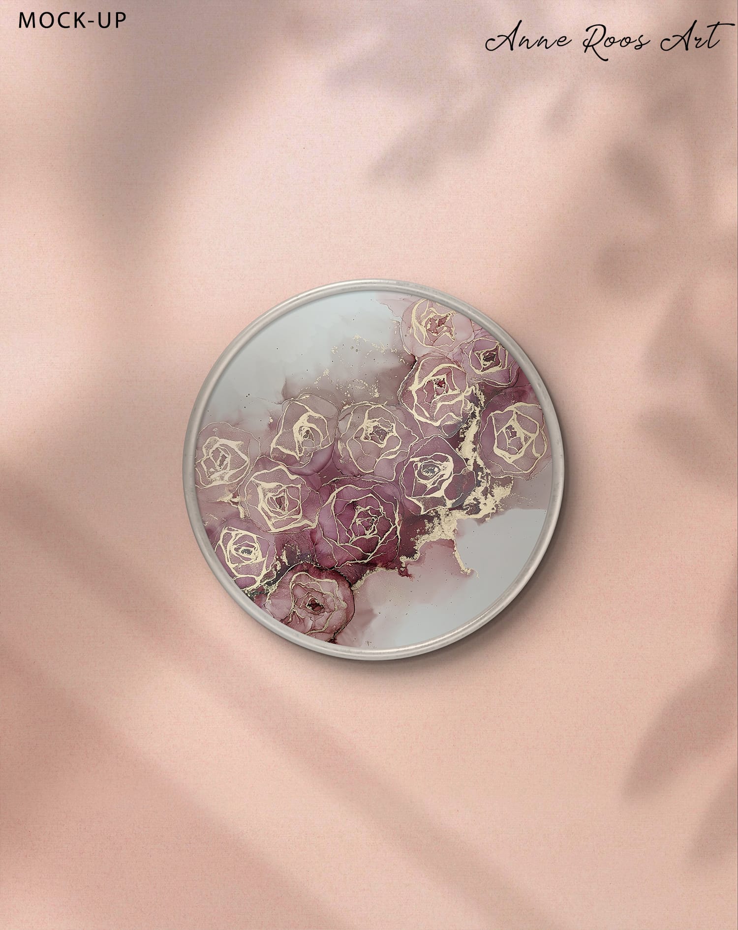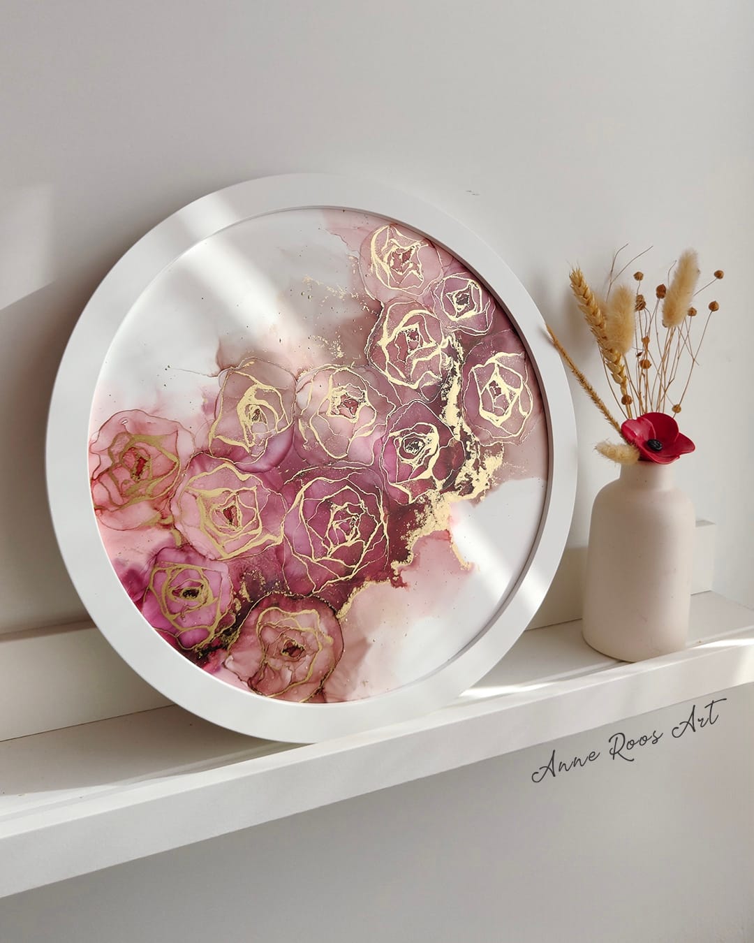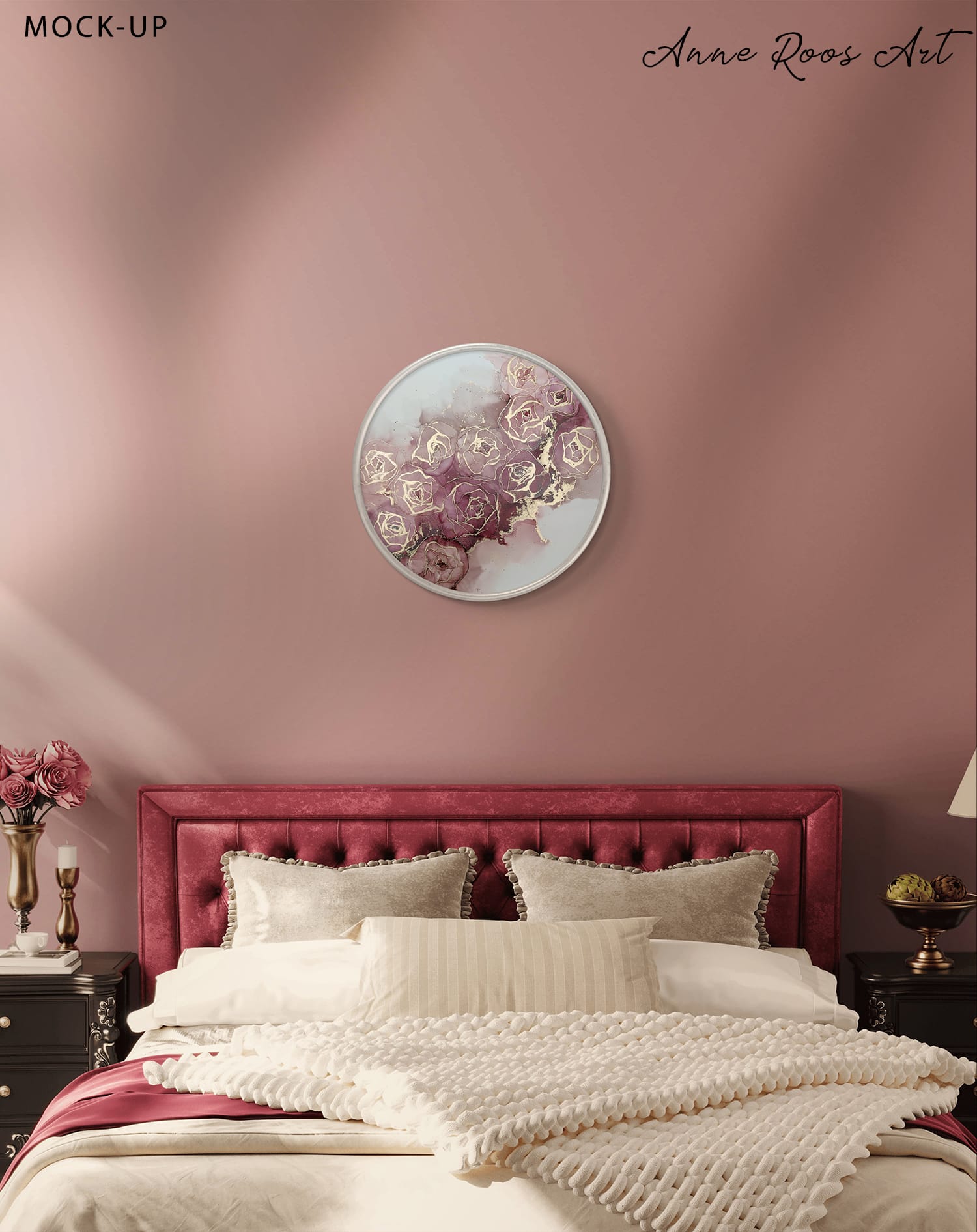 Romantic Roses is an original artwork with my signature roses. This romantic color palette beautifully blends into each other: The beige and soft pink colors together with the contrasting, deep purple gives a romantic and dramatic look to the artwork. Finished with the iconic golden metallic lines that will beautifully reflect in daylight. A true eye-catcher for any living room, bedroom or study.
